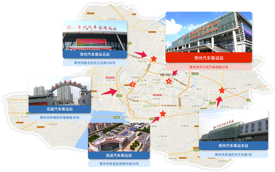 常州汽車客運(yùn)站于2010年建成,地處常州北大門,是集高鐵、地鐵、公交為一體的綜合樞紐客運(yùn)站。車站擁有11000平方米的候車、售票廳和32600平方米停車場(chǎng),內(nèi)設(shè)售票窗口5個(gè),檢票窗口30個(gè),是常州地區(qū)最大的公路客運(yùn)站。